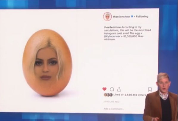 2019 yılının ilk ayında açılan World_record_egg adlı Instagram hesabı tarafından paylaşılan, bembeyaz bir zemin üzerinde sade yumurta fotoğrafı, beğeni rekoru kırmak için Instagram üzerinde tam bir rekabet ortamına dönüşmüştü. 4 Ocak tarihi itibari ile Jenner’ın paylaşımını geçmeyi başaran yumurta, 16 Ocak tarihinde 44 milyon beğeni sayısına ulaşmıştı. Sosyal medya platformları olan Twitter ve Instagram’da ise bu olaylar çalkalanırken, Amerika Birleşik Devletleri’nde bir program sunucusu olan Ellen DeGeneres, espirili bir fotoğraf ile oldukça çok konuşulacak bir paylaşıma imzasını atmış oldu. DeGeneres, Jenner ve yumurta görsellerini birleştirerek, sosyal medya platformu olan Instagram hesabından paylaştığı görselin altına ise şu sözlere yer verdi; “Hesaplamalarıma göre, bu şimdiye kadar en çok beğeni alan Instagram paylaşımı olacak! Yumurta + Kylie Jenner = minimum 51.000.000 beğeni"