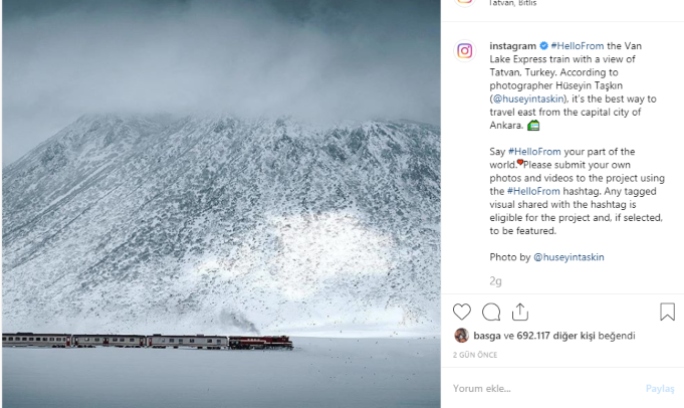 Bunun yanı sıra fotoğrafta ilgi çeken bir diğer bir detay ise Instagram’ın resmi hesabından paylaşmış olduğu bu fotoğrafın altına yaptığı detaylı açıklama oldu. Instagram tarafından paylaşılan fotoğraf Ankara’dan doğuya doğru seyahat etmenin en iyi seçeneklerinden biri olan Van Gölü Ekspresi’ne aitti. Instagram yaptığı paylaşımda bu detaya da yer verdi. Karla kaplı bir görsel şölen sunan bu fotoğraf ise kullanıcılar tarafından beğeni yağmuruna tutuldu. #HelloFrom Hastag’i ile dünyanın her yerinden en güzel fotoğraf karelerini yayınlayan Instagram’ın paylaştığı Van Gölü Ekspresi fotoğrafı güzelliğiyle tüm dünyayı büyüledi.