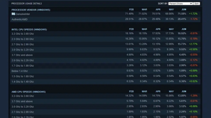 Ocak ayında yayımlanan verilere göre Intel'in pazar payı yüzde 66.51’ken, AMD ise yüzde 33.49 pazar payına sahipti. Intel bundan önce uzun bir süredir liderlik koltuğuna sahip olsa da AMD'nin geçmişte ulaşamadığı yüzde 30'luk pazar payını geçtiği ve yükselişini sürdürdüğünü açıklanmıştı. Haziran ayında yapılan Steam Donanım Anketi ise Intel işlemcilerinin kullanım oranının yüzde 1.72 oranında arttığını ve AMD'nin düşüşe geçtiğini gözler önüne serdi.