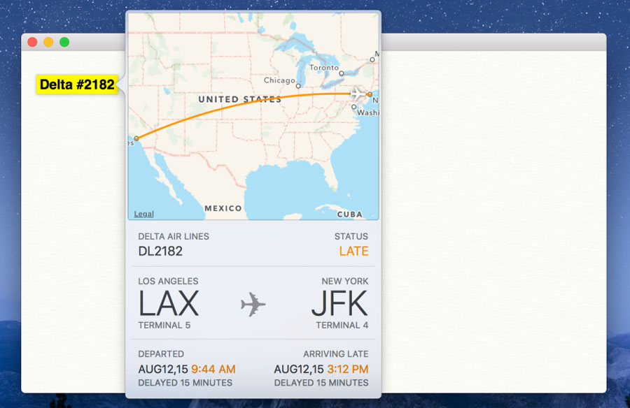 Özellikle zamanın çoğunluğunu seyahat ederek geçiren kullanıcılar için geliştirilen "uçuş veri dedektörü" özelliği hem iOS 9 üzerinde hem de OS X El Capitan üzerinde kısa süre içinde kullanıma sunulacak.