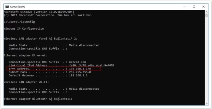Cihaz üzerinden Local IP adresinizi sorgulamak için yapmanız gereken bilgisayarınızın arama çubuğuna girerek “CMD” yazmak. Ardından karşınıza çıkan “Komut İstemi”ne tıklayarak ekrana “ipconfing” yazarak “Enter” tuşuna basın. Karşınıza çıkacak ekrandan “Ipv4 Address” satırını bulun ve işte karşınızda “Local Ip” adresiniz.