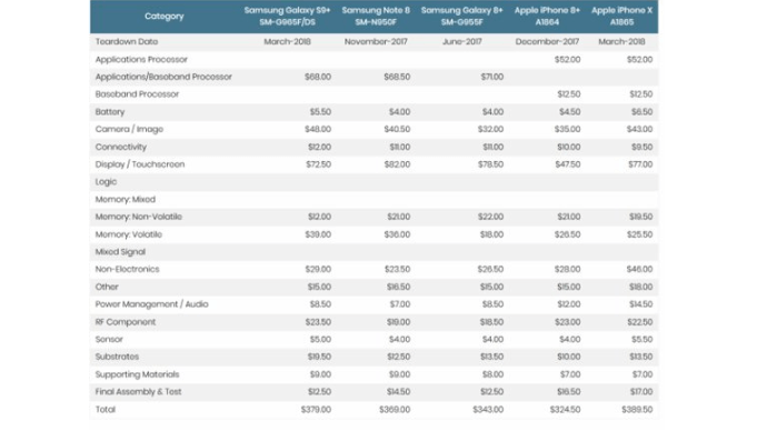 Şirket tarafından yapılan analiz ile üretim maliyetleri kullanılan bileşen fiyatlarına göre belirlenmiş durumda. Bu noktada yeni amiral gemisi Galaxy S9 Plus'ın maliyetinin Galaxy Note 8 cihazına göre daha yüksek olduğu gözüküyor. Bu fark satış fiyatına yansımış olsada, iki cihaz arasında maliyet noktasında 10 dolarlık bir oynama bulunuyor. Baktığımız zaman Galaxy Note 8, 369 dolar ve Galaxy S9 Plus'ın ise 379 dolar üretim maliyeti olduğu gözüküyor.