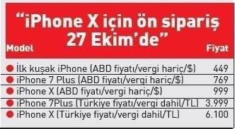 Geçen hafta Apple, iPhone 8, iPhone 8 Plus, iPhone X ve akıllı saat Apple Watch 3 ile Apple TV'yi tanıttı. İphone X Şimdiye kadar satışa sunulan en pahalı telefon olma özelliğini taşıyor. ABD'de 999 dolar fiyat etiketiyle satışa çıkacak telefonun Türkiye'de vergiler dahil 6.100TL den başlayan fiyatlarla satışa sunulması bekleniyor. Tüm dünyada aynı anda 3 Kasım'da satışa sunulacak telefon, teknoloji severlerin ilgi odağı konumunda.
