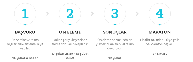 Yazdıkları kodlar ile 17 Şubat saat 23:59'dan 18 Şubat saat 23:59'a kadar sürecek olan Online ön elemeyi geçen katılımcılar, İTÜ Maslak Kampüsüne davet edilecek ve 2 gün boyunca sponsor şirketlerden gelen soruları cevaplayacaklar. Ön elemeyi geçen takımlar 19 Şubat günü yarışmanın resmi web sitesinde ilan edilecek.