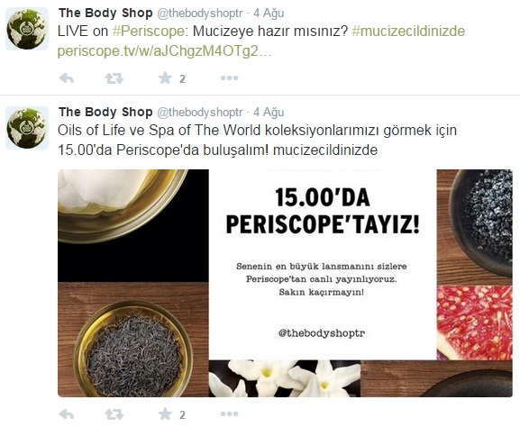 Bu markalardan biri @thebodyshoptr. Twitter hesabından yeni koleksiyonunu canlı yayında görmek isteyen takipçilerini Periscope yayınlarına davet eden marka, benzer etkinlikleri düzenli olarak yapıyor.
