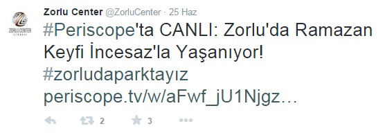 Zorlu Center'ın etkinlikleri de Periscope'da. Duyuruları ise Twitter hesabı @ZorluCenter ?da.