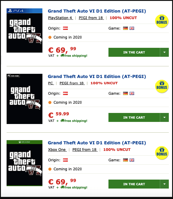 Fotoğrafta gözükenlere göre GTA 6’nın D1 Edition adlı bir sürümü gözüküyor. Bunun ne anlama geldiği bilinmiyor. Ancak site kaynaklı bir hatadan ötürü böyle bir listeleme olduğu düşünülüyor. Gameware sitesi tarafından da konu hakkında herhangi bir açıklama yapılmış değil. Listeleme ile beraber oyunun fiyatı da ortaya çıkıyor. Buna göre GTA 6’nın PC sürümü için 59.99 euro (400 TL) PlayStation 4 ve Xbox One sürümleri için 69 euro (460 TL) fiyat etiketlerine sahip olacak. Ancak hangi sürüm için bu fiyatların geçerli olduğu bilinmiyor.