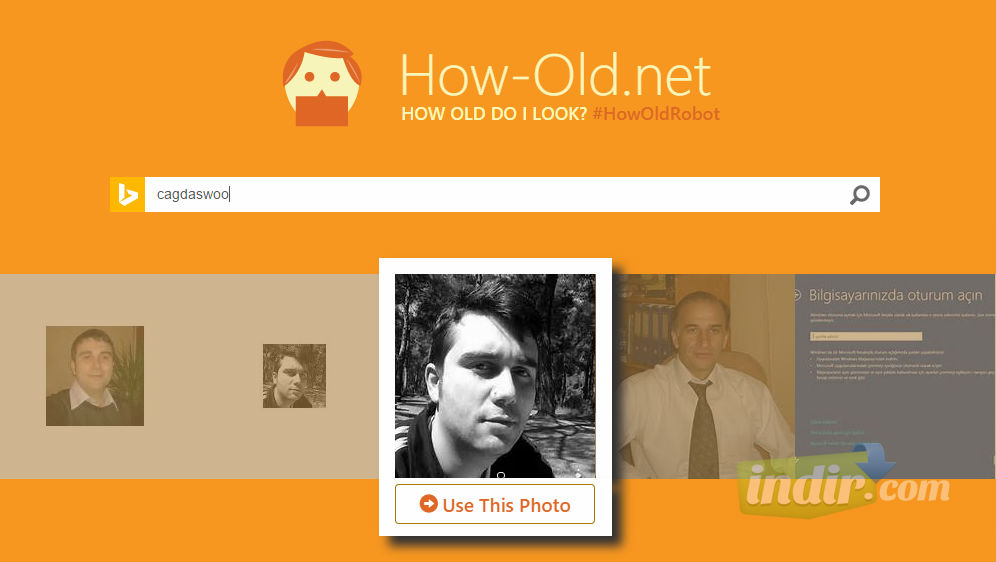 Siteyi iki farklı şekilde kullanarak yaş ve cinsiyet tahmini yaptırabilirsiniz. Bunlardan ilki; Yaşını merak ettiğiniz kişinin ismini sitedeki 'Bing' arama motoru kutucuğuna yazarak ve ortaya çıkan fotoğraflardan birisini seçip altındaki 'Use This Photo' butonuna tıklayarak yapabilirsiniz.