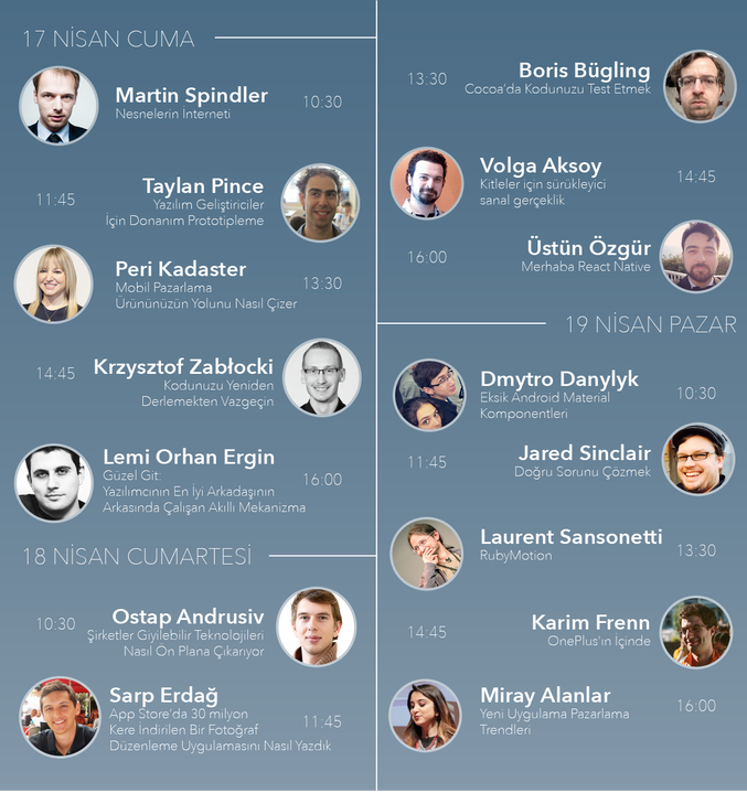 RubyMotion'dan Laurent Sansonetti, OnePlus'dan Karim Freen, Internet of People?dan Martin Spindler gibi dünya isimlerinin yanında 30 Milyondan fazla indirilmeye sahip mobil fotoğraf düzenleme uygulaması PicLab'in yaratıcısı Sarp Erdağ'ın katılacağı etkinlik 17, 18, 19 Nisan 2015'da Bilkent Üniversitesi Mithat Çoruh Amfi'de gerçekleşecek.