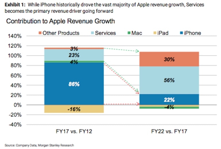 Analist Katy L. Huberty, önümüzdeki 5 yıl içerisinde Apple'ın elde ettiği toplam gelirin yarısını Apple servislerinden sağlayacağını söylüyor. Paylaşılan grafikte, Apple'ın 2012-2017 fikstür yıllarında gelirlerinin yüzde 86'sını iPhone'ların oluşturduğu görülüyor. Önümüzdeki yıllar içerisinde iPhone'ların oluşturduğu yüzde 86'lık kısmın Yüzde 22'e düşmesi bekleniyor. Apple servislerinin, yine grafiğe göre 2012 ' 2017 yıllarında yüzde 23'lük bir dilime sahip olduğu görülüyor. Bu oranın ilerleyen yıllarda, yüzde 56'ya çıkması bekleniyor.