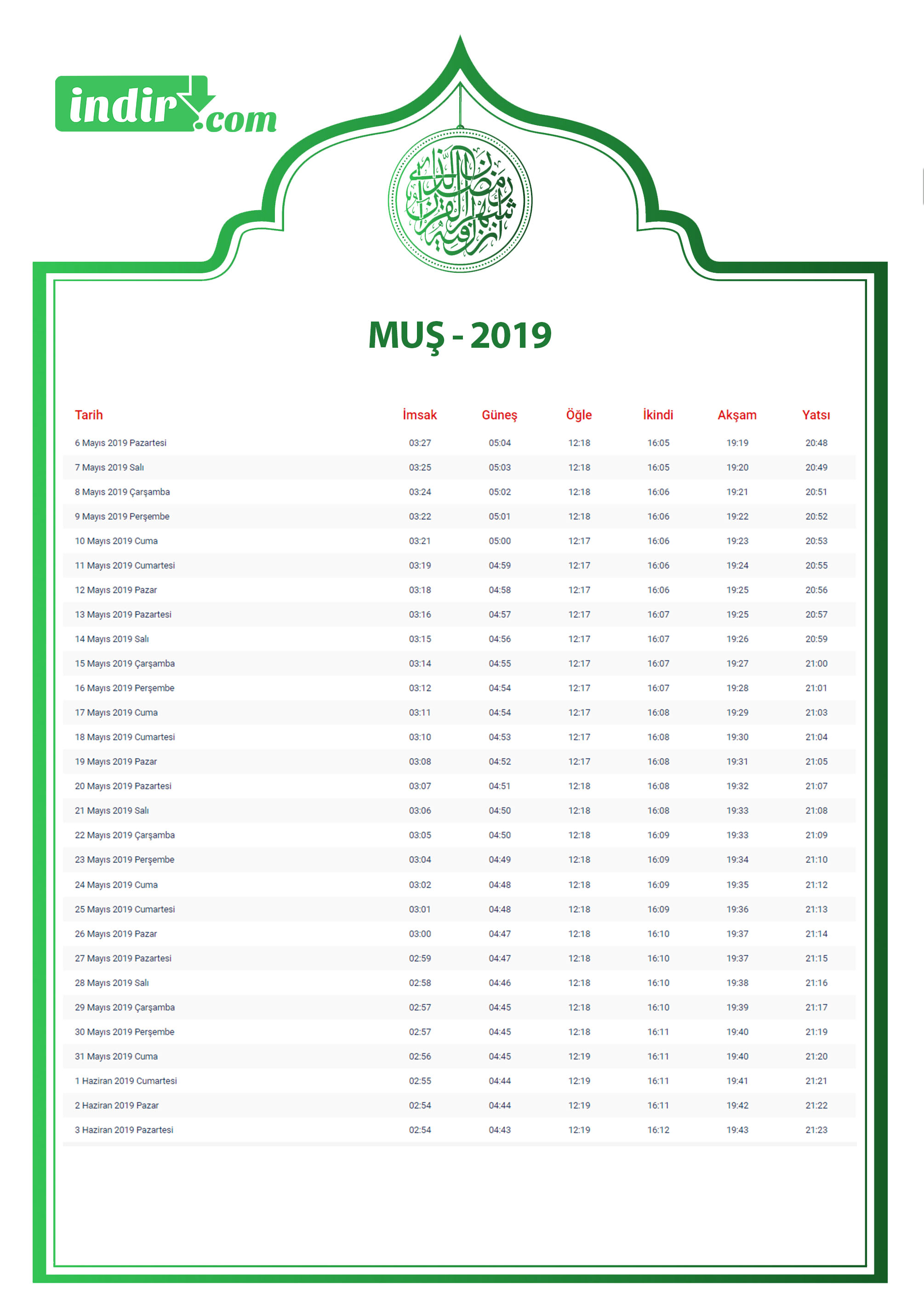 Muş İmsakiye İndir 2019 - İftar Vakti İndir