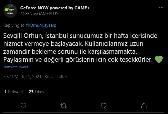 Nvidia GeForce Now Yetkilileri tarafından yapılan açıklamalarda kullanıcının sorusuna cevap olarak “Sevgili Orhun, İstanbul sunucumuz bir hafta içerisinde hizmet vermeye başlayacak. Kullanıcılarımız uzun zamandır bekleme sorunu ile karşılaşmamakta. Paylaşımın ve değerli görüşlerin için çok teşekkürler.” denildi. Konuyla ilgili paylaşım ise şöyle;