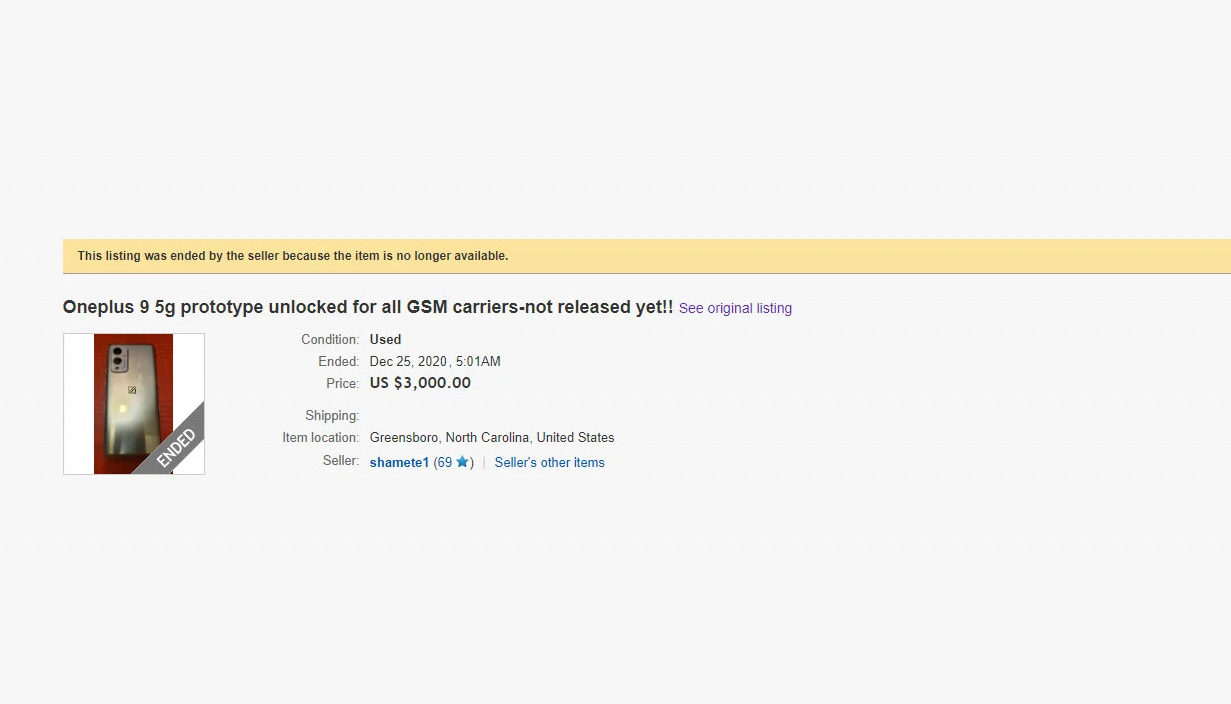 Gizemli bir kullanıcı tarafından satışa sunulan OnePlus 9, görüntüleri de ortaya çıkan prototip ile aynı olduğu gözüküyor. Paylaşılan görüntülere ek olarak cihazın özelliklerini de gösteren bazı görüntüler paylaşıldı. Görüntüler kısa süre listeleme ekranında kaldı ve daha sonra kaldırıldı. Tüm bu detaylar ile beraber OnePlus 9 prototipi 3000 dolar alıcı bulduğu gözüküyor.
