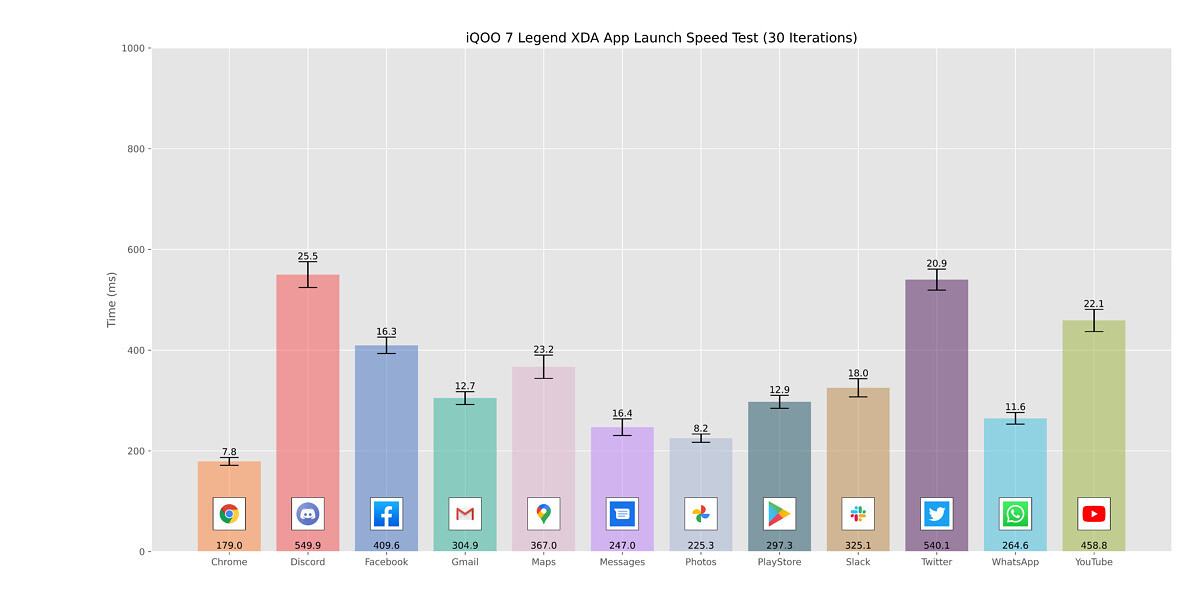 iQOO 7 Legend için uygulama açılış testinde rakamlar gerçekten etkileyici. Google Chrome, Mesajlar, Fotoğraflar, Play Store ve WhatsApp gibi uygulamaların yüklemeleri 0,3 saniyeden kısa sürerken, Facebook, Slack, YouTube ve Haritalar'ın yüklenmesi 0,5 saniye altında kaldı. Cihazda ART ++ Turbo gibi ek özellikler ve yapılan optimizasyonlar, performansın daha da artmasını sağlıyor.