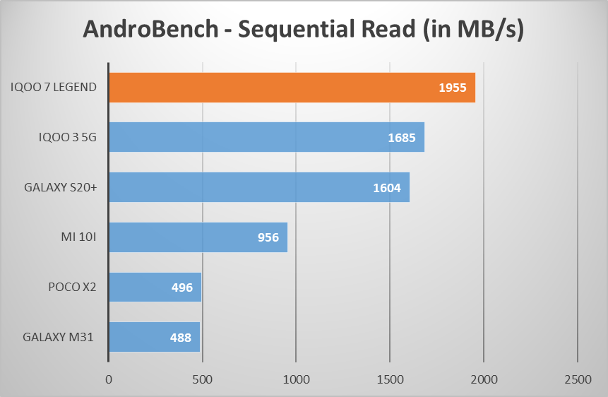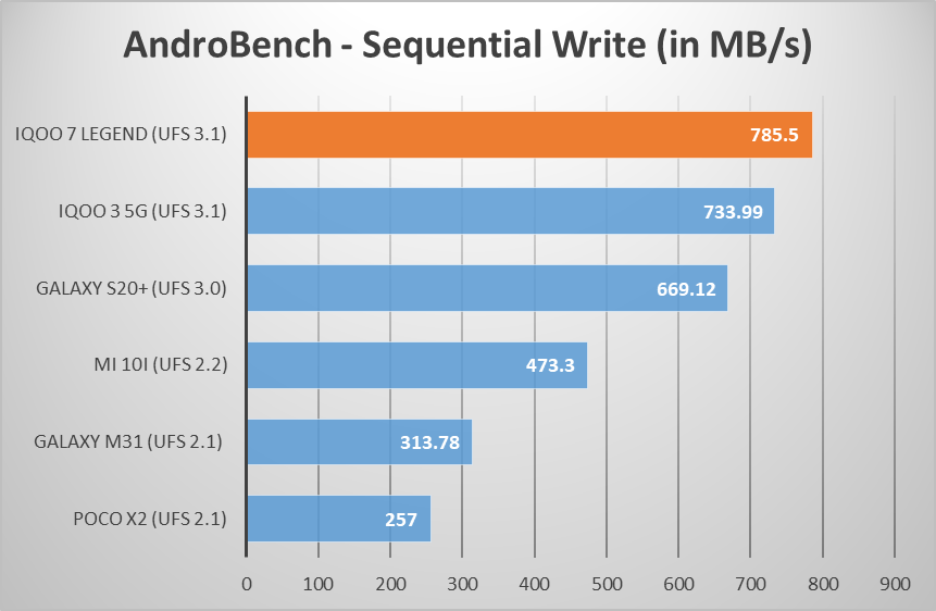 UFS 3.1 flash depolama ile piyasaya çıkan ilk telefonlar arasında yer alan iQOO 7 Legend, bir önceki modeline göre yüzde 22 oranında daha hızlı okuma ve yazma hızları sunuyor. Yapılan testlerde pek çok model geride kalırken, iQOO 7 Legend zirveye yerleşmeyi başardı.
