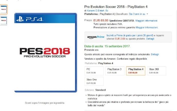 Futbol oyunlarının başında gelen yapımlardan Pro Evolution Soccer'un bu yıl çıkması beklenen yeni serisi PES 2018 kendisini göstermeye başladı. Böylece oyunun resmi duyurusu henüz gerçekleşmemiş olsa da, çıkacağına dair sinyaller alınmış oldu. Oyunun henüz nasıl olacağı ve nelerle oyuncuların karşısına çıkacağına dair herhangi bir bilgi yok. Bu tarz bilgiler genellikle oyun severlerle yaz aylarında paylaşılmaya başlıyor. Fakat dünyanın en büyük alışveriş sitelerinden biri olan Amazon'un İtalya ayağında, PES 2018 'in listelendiği görüldü. Böylece oyunla ilgili ilk bilgi gelmiş oldu. Listede adı görülen PES 2018'in çıkış tarihinde 15 Eylül 2017 tarihi yazıyordu. Yine listeye göre PES 2018, PC, PS4, PS3, Xbox One ve Xbox 360 platformları için çıkış yapacak. Oyunla alakalı listede yer alan açıklamalara bakıldığında, oyun motorunun yenilendiği ve daha gerçekçi bir oyun anlayışının oyunculara sunulacağı bilgisi yer alıyor. Konami'den konuyla alakalı resmi bir açıklama gelmedi. İlerleyen günlerde yapımın resmi duyurusu da yapılacaktır.