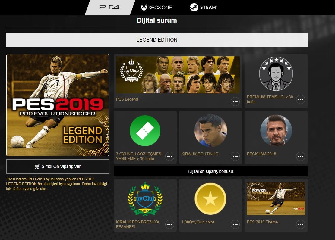 Yine PS 4'e özel PES 2019 temalı Legend Edition içeriği şu şekilde;