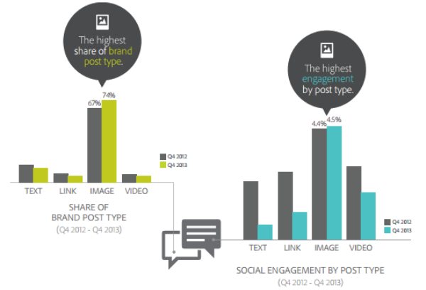Markaların iletilerine olan sosyal ilgi ise Facebook'ta geçen yıla göre yüzde 180 oranında artış yaşanırken, marka iletisi gösterimlerinde yüzde 150 oranında yükseliş kaydedilmiş. Görsel içerikli marka iletilerine olan ilgi ise yüzde 10'luk normal metin iletilerine göre yüzde 650 oranında artış göstermiş. Bunun yanı sıra bağlantı, metin veya video içeren iletiler de geçen yıla göre daha az ilgi görmüş.