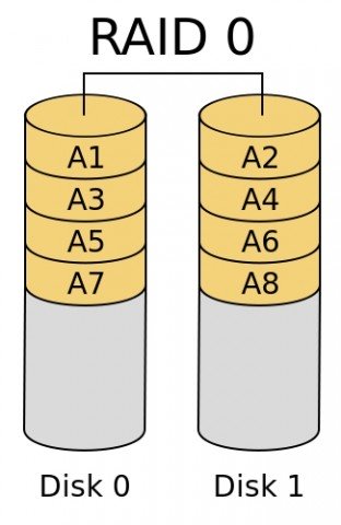 RAID0 yapılandırması için en az iki veya daha fazla sürücü gerekiyor. Bu sürücü dizisi, aynı türden sisteme bağlanmış olan diskler üzerinde ardışık bloklara bölünerek yazdırılır. İki veya daha fazla diski birleştirir ve sıralı erişimde daha iyi bir okuma /yazma performansı elde edilmiş olunuyor. Ancak RAID0 dizisinde artıklık bilgileri saklanmaz ve sürücülerden birisi hasar aldığı zaman veriler tamamen kaybedilebilir.