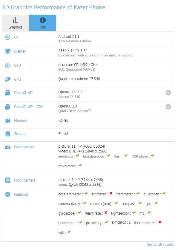 Android 7.1.1 Nougat işletim sistemi ile çalışacak cihazın 8MP ön kamerası ve 4K video kaydını desteklemiş olan 12MP arka kamerası bulunmaktadır. Söylentilere göre Razer akıllı telefon, en tutkulu oyuncular için geliştirilmiş ve tasarlanmış.