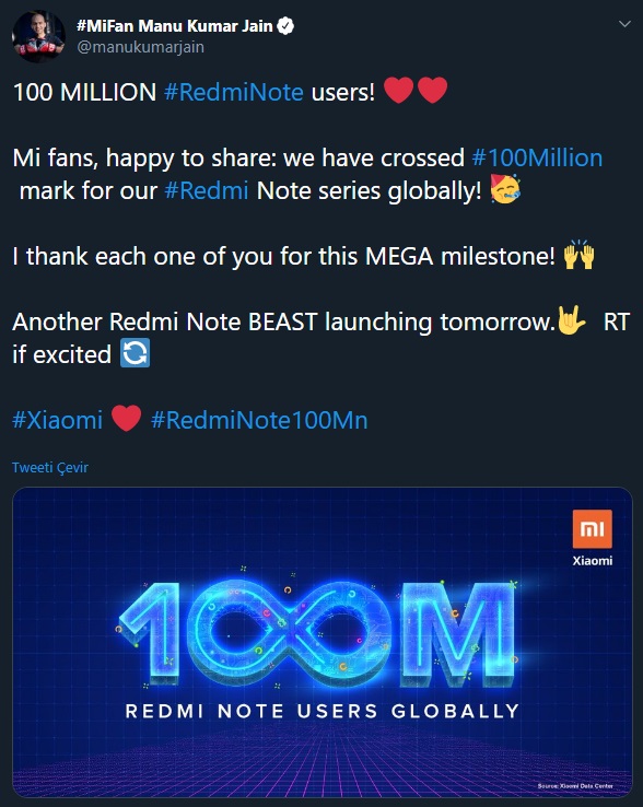 Çinli marka Xiaomi dünya genelinde 100 milyon Redmi Note serisi akıllı telefon satışı yaptığını açıkladı. Xiaomi uygun fiyatla yüksek performans sunan donanımlar sunabildiği için bu satış rakamlarını artırmaya yoğunlaşmış ve ayrıca Xiaomi'nin en yeni Redmi Note serisi cihazı, Redmi Note 8 Pro'nun ülkemiz genelinde görücüye çıktığını söyleyelim. Xiaomi Hindistan Genel Müdürü olan Manu Kumar Jain tarafından atılan bir tweet ile ortaya çıkan Redmi Note serisinin satış rakamları, 100 milyon'u geçtiği duyuruldu.