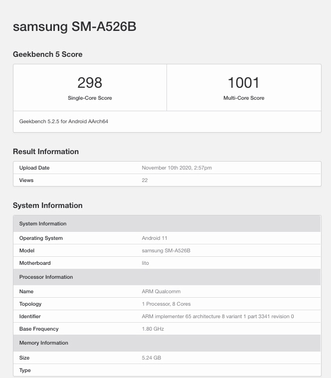 Bunun yanı sıra Galaxy A52 5G’ın 6 GB RAM desteği ile kullanıcı karşısına çıkacağı da raporda yer alan bilgiler arasında. Performans testinin sonucuna baktığımızda ise Galaxy A52 5G’ın tekli işlem testinde 298 puan ve çoklu işlem testinde 1.001 puan aldığı görülüyoruz. Bu sonuçlar cihazın henüz ailenin bir önceki modeli olan Galaxy A51’e göre geride olduğu gösteriyor. Hatırlarsanız Galaxy A51’in Geekbench testinde puani 700 civarında ve çoklu işlem testinde 1800 civarındaydı. Ancak Galaxy A52 5G modelinin henüz tanıtılmadığını düşünürsek Samsung’un cihazda bazı iyileştirmeler yapmak için henüz zamanı olduğunu da söyleyebiliriz. Şirketin Galaxy A52 5G modeliyle nasıl bir başarı yakalayacağını ilerleyen zamanlarda göreceğiz.