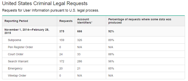 1 Kasım 2014 - 28 Şubat 2015 tarihleri arasını kapsayan Snapchat şeffaflık raporuna göre; servisten farklı hesaplar için devletlerden 403 adet veri talep edilmiş. Bu taleplerin 375'i ABD hükümeti tarafından yapılmış. Taleplerle ilgili olarak Snapchat, 666 adet Snapchat hesabının olduğunu belirterek, ABD hükümetinin taleplerinin sadece yüzde 93'üne yanıt vermiş.