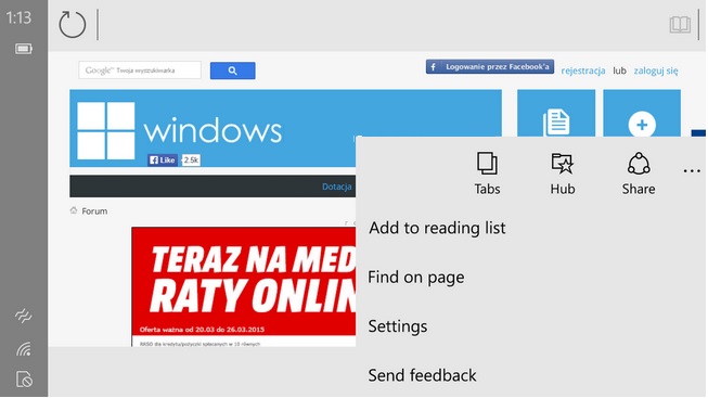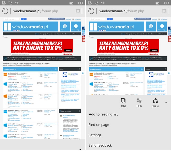 Windows Phone'da kurulu olan Internet Explorer'ın adres çubuğu aşağıda yer alırken Spartan'da eski düzene bir dönüş yapıldığı dikkat çekiyor. Ayrıca tarayıcı seçeneklerinin içinde metinleri kaydederek çevrimdışı okuyabilme fonksiyonu bulunuyor.