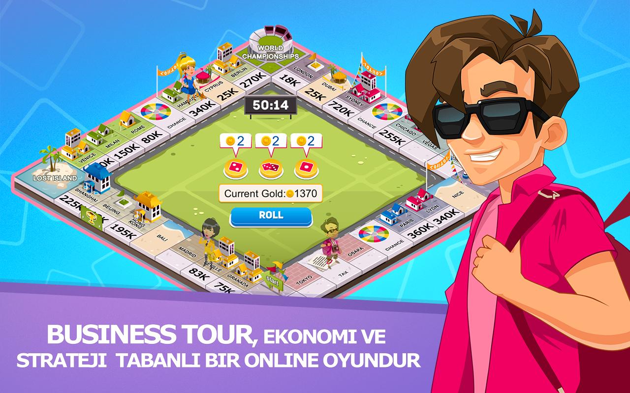 Sevilen Monopoly oyunu ile benzerlik gösteren Business Tour, arkadaşlarınız ile beraber ya da dünyada oyuncularla anlık oyunlara dahil olarak eşsiz bir deneyim yaşamanızı sağlıyor. Oyunda, haritada yer alan şehirleri satın alıp, ev otel gibi kazançlar elde etmeye çalışacaksınız. Rakiplerinizin mülkü sizden fazla olursa oyunu kaybedersiniz. Oyuna ilk başladığınızda özel oda kurmanız ücretsizdir fakat ilerleyen seviyelerde 1 dolar ödemeniz gerekiyor.