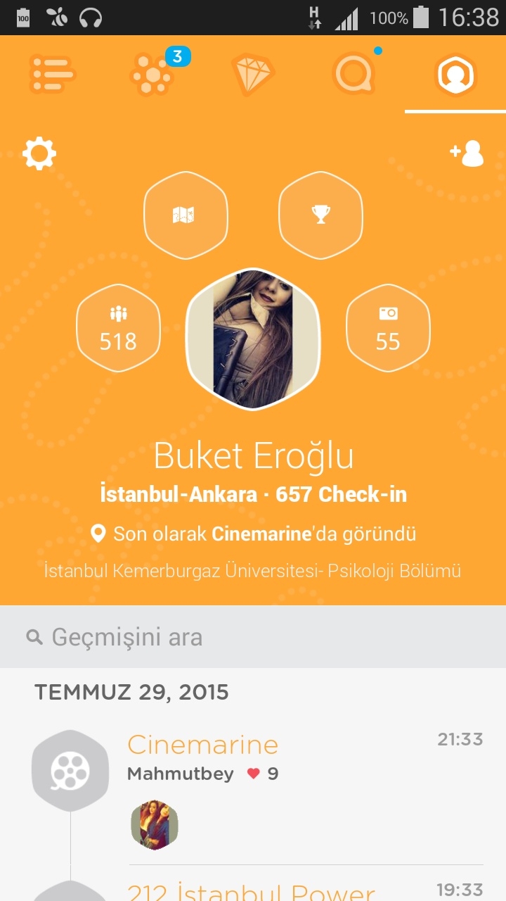 Profilinizin sol üst kısmında bildirimlerinizi görebilirsiniz, sağ üst kısım ise yeni arkadaş eklemenize yarar. Profil fotoğrafınızın üzerinde yer alan butonlar ise soldan itibaren ilki, arkadaş listenizi görüntüler. İkincisi, sizin yer bildirimi yaptığınız yerleri gösterir, üçüncüsü, puan durumunuzu görüntüler ve sonuncusu da yer bildirimi yaptığınız esnada paylaştığınız fotoğrafları görmenizi sağlar. Uygulamanın ayarlar kısmından, profilinizde yapmak istediğiniz değişiklikleri yapabilir ve bildirimlerinizi yönetebilirsiniz.