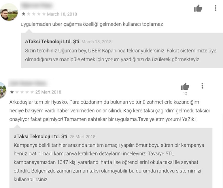 Google Play Store üzerinde şu an kullanılabilir olan uygulamayı kullananlar, uygulama hakkındaki yorumlarını da dile getirdiler. Bazı yorumlarda, UBER'i öven ya da olumsuz ifadelerin yer alması, geliştiricilerden gelen cevapların sert olmasına da neden oldu. Örnek yorum ve cevapları aşağıdan inceleyebilirsiniz;