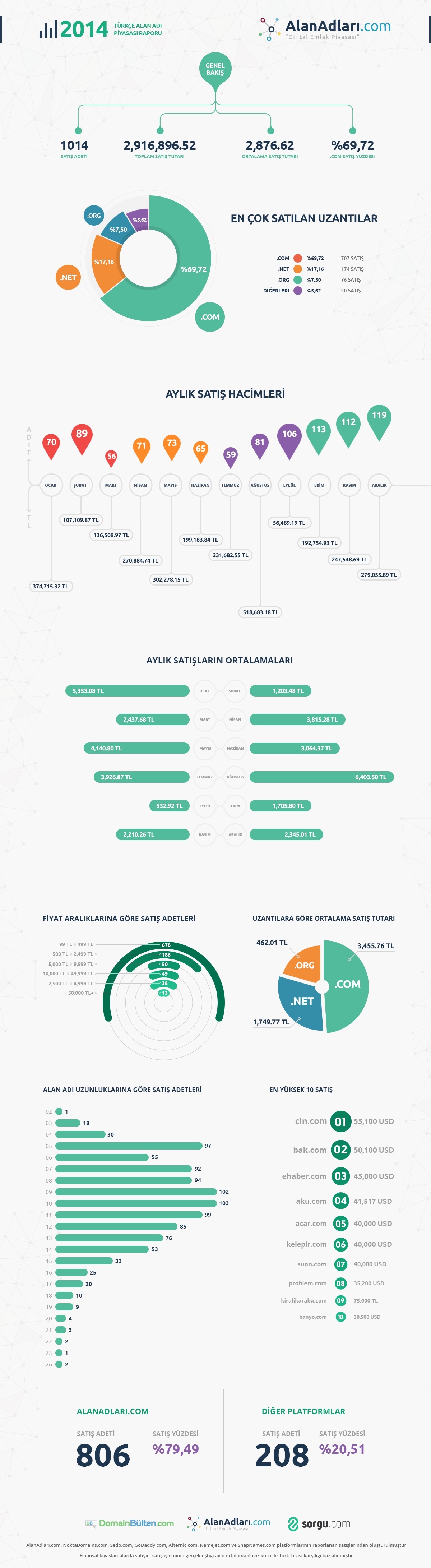 Türkiye'nin alan adı ticaret platformu alanadlari.com, Türkçe alan adı pazarının 2014 raporunu bir infografik ile yayınladı. Rapora göre Türkçe alan adı satışları 3 milyon TL'ye yaklaşmış durumda.