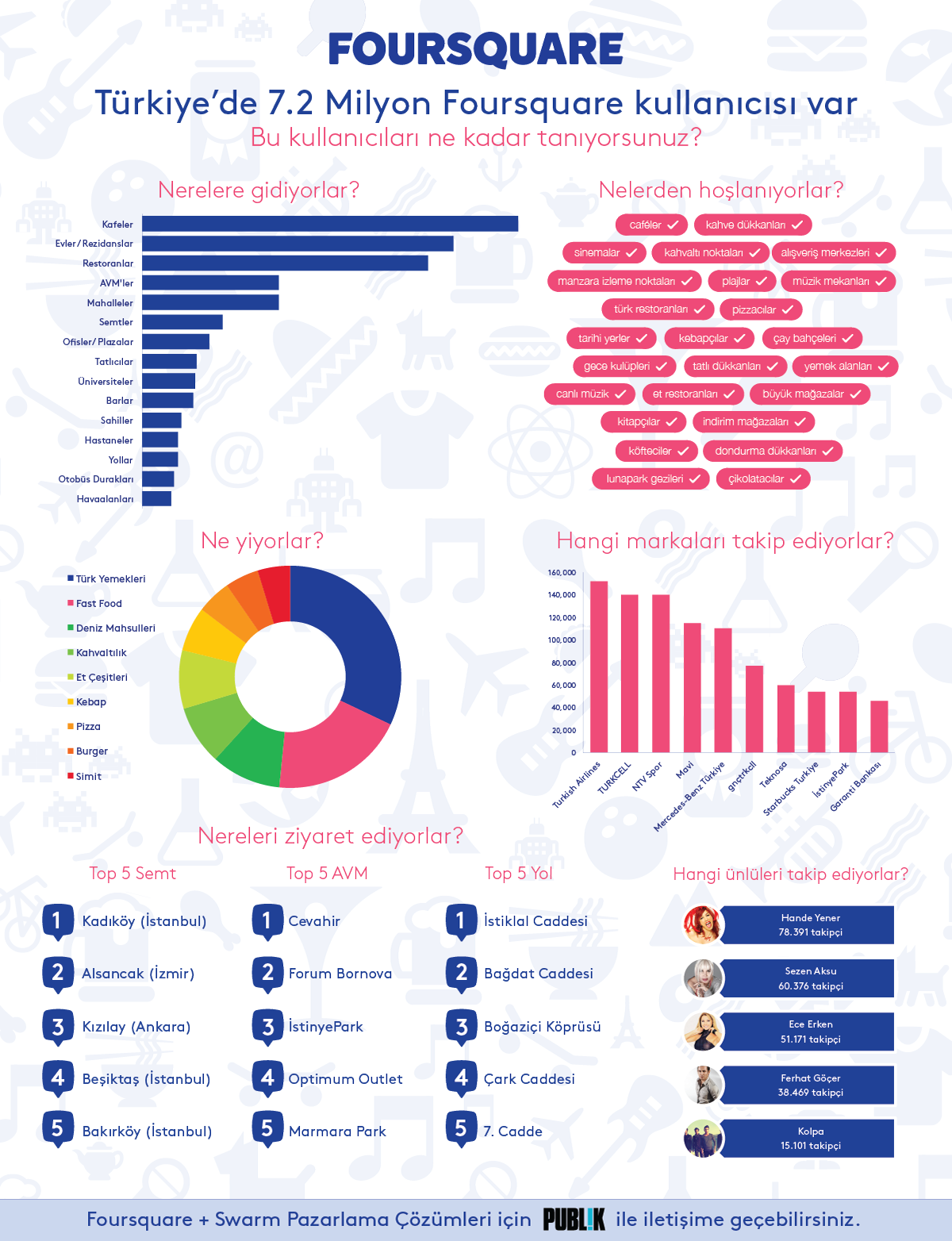 Kullanıcılar hakkında pek çok verinin paylaşıldığı infografiğe göre Türkiye'deki Foursquare kullanıcıları en çok kafeler, rezidanslar, restoranlar ve avm'lerden check-in yapıyor. Kullanıcıların ne yediklerini de gözler önüne seren infografiğe göre en çok Türk yemekleri, Fast Food, Deniz Mahsulleri ve kahvaltılık ürünler tercih ediliyor.