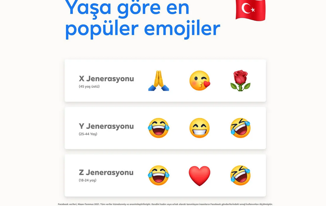 Facebook’un yaptığı araştırmaya göre farklı yaş grubundan kullanıcılar, farklı emojileri daha çok tercih ediyorlar. Bu noktada 45 yaş üzeri X kuşağı kullanıcılar sevgiye yönelik emojileri tercih ederken, Y ve Z kuşağı ise gülme emojilerini sıklıkla tercih ediyorlar. Facebook araştırmasına göre kadınlar ve erkeklerin emoji kullanımları da ayrılıyor. Erkekler daha çok mutluluk gözyaşı emojisini tercih ederken, kadınlar ise kalpli öpücük emojisini daha fazla kullanıyorlar. Türkiye’de en fazla gülme ifadeli emojiler kullanılsa da, farklı emojilere de ilgi gösteriliyor.