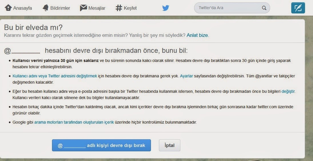 Twitter hesabınızı silmek için https://twitter.com/settings/accounts/confirm_deactivation linkine giriş yapın. Eğer hesabınız açık değilse hesabınızı açın ve yönlendirildiğiniz sayfanın en altında, '@---' adlı kişiyi devre dışı bırak yazan yere tıklayın. Böylece hesabınızı kalıcı olarak silmiş olursunuz. Eğer hesabınızı sonradan geri almak isterseniz, silme işlemini 30 gün içerisinde iptal edebilirsiniz. Kullanıcı adınızı, gelecekte açacağınız yeni bir hesapta kullanmak isterseniz, hesabınızı silmeden önce kullanıcı adınızı değiştirebilirsiniz. Twitter hesabınızın silinme süresi, 30 günü bulmaktadır. 30 gün boyunca işlemi geri almadığınız takdirde, hesabınız kalıcı olarak silinir.