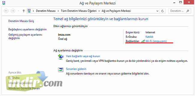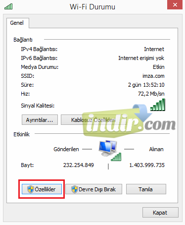 Karşınıza çıkan pencereden 'Bağlantılar' ın karşısındaki (kullandığınız) ağ bağlantısına tıklayın. Ardından 'Wi-Fi durumu' penceresi açılacak ve bu pencerenin sol alt tarafında görülen 'Özellikler' butonuna basın.
