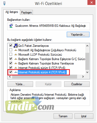 Karşınıza 'Wi-Fi özellikleri' penceresi çıkacak. Buradan 'Ağ iletişimi' sekmesine girmeniz ve 'İnternet Protokolü Sürüm 4 (TCP/IPv4) seçeneğini bularak, üzerine çift tıklayın.