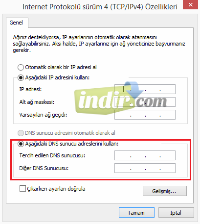 Açılan pencerede 'Aşağıdaki DNS sunucu adreslerini kullan'ı işaretleyerek DNS adreslerini gireceğiniz kutucukların aktif olmasını sağlayın. Ardından bulduğunuz hızlı ve güncel DNS adreslerini bu kutucuklara girerek 'Çıkarken ayarları doğrula' seçeneğini işaretleyip 'Tamam' butonuna tıklayın.