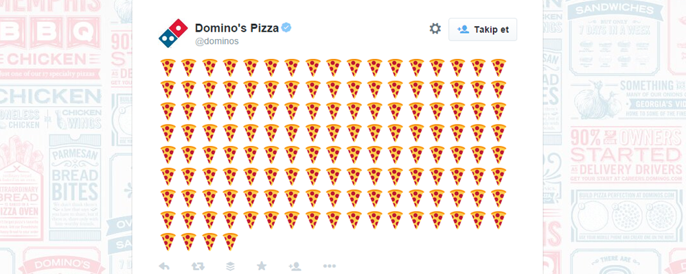 Artık Emojiler ile pizza sipariş dönemi başlıyor. Dünyanın en büyük fast food zincirlerinden Domino's Pizza, kullanıcıların Twitter üzerinden tek tweet ile pizza siparişi vermelerini sağlamak için hazırlıklara başladı.
