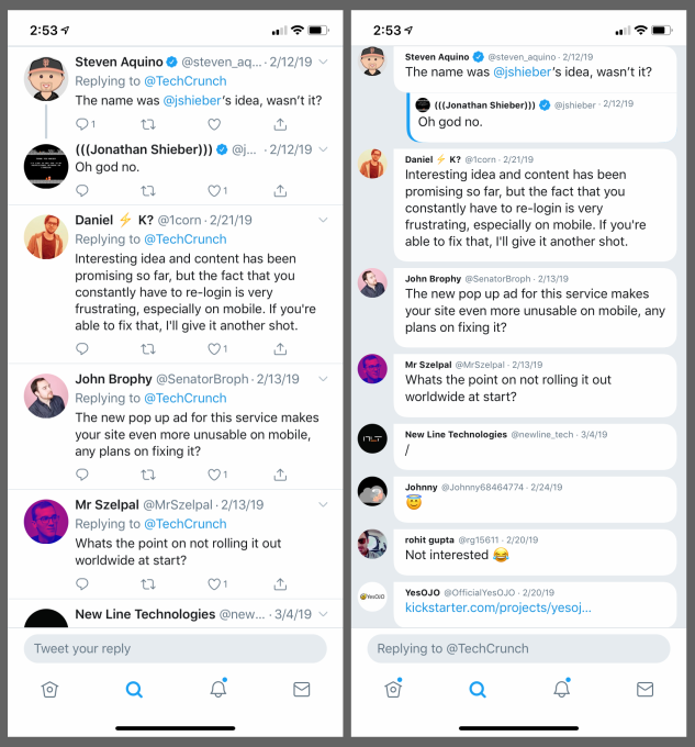 En büyük yenilikler arasında ise yanıtlar bölümün bulunuyor. Bir Tweete gelen bir yanıt gri bir çizgi ile ana yanıta bağlanmış oluyor. Fakat birçok yanıt içerisinde bir karışıklık meydana geldiği kesin oluyor. Yeni tasarımda ise tıpkı Facebook gibi küçük bir baloncuk içerisinde yanıt gözüküyor ve bu sayede kimin hangi yanıt attığı rahat bir şekilde ayırt edilebiliyor.