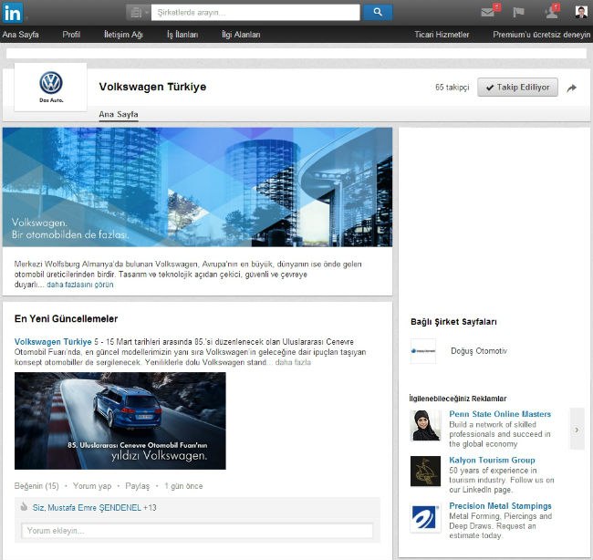 Volkswagen Binek Araç, var olduğu diğer sosyal platformlarda olduğu gibi www.linkedin.com/company/