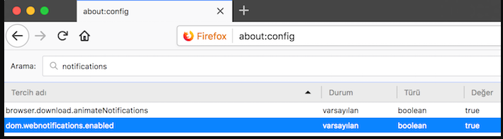 - Arama kutucuğuna “Notification” yazarak “dom.webnotification.enabled” seçeneğine çift tıklayın.
