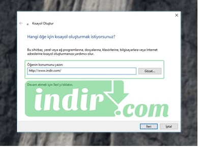 Ve ardından ileri yolunu izleyin. Sıradaki pencerede ise masaüstüne eklenirken 'hangi isim' ile eklenecek onu yazın ve ileri butonuna tıklayın.
