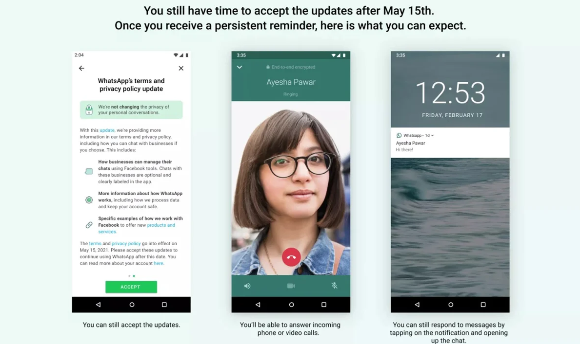 WhatsApp tarafından yapılan duyuruya göre kullanıcıların yeni gizlilik politikasını kabul etmek için son günün 15 Mayıs tarihi olduğu netleştirildi. Ancak 15 Mayıs tarihinde kullanıcıların hesapları silinmeyecek, bunun yerine bu tarihten itibaren hala sözleşmeyi kabul etmeyenlerin WhatsApp’ta yapabilecekleri sınırlandırılacak. Yapılan açıklamaya göre sözleşmeyi kabul etmeyenler, kabul edilmesi istenen bildirimi görmeye devam edecekler. Daha sonra ise bu bildirim kalıcı hale gelecek ve kullanıcılar ilk etapta sohbet listelerine erişemeyecekler. Ancak yine de gelen telefon ve video çağrılarına cevap verebilecekler.