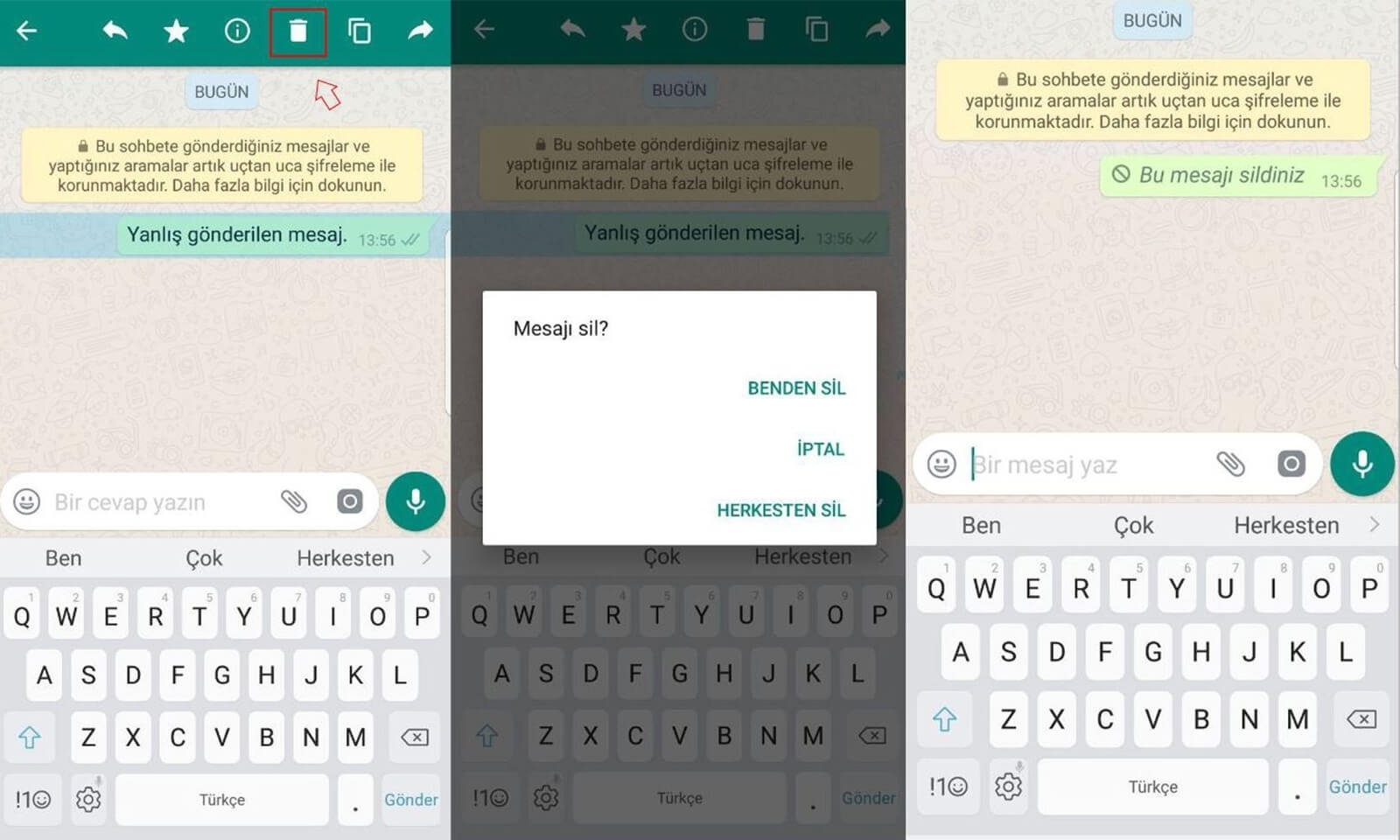 Özelliğin nasıl kullanıldığına gelirsek; Örneğin bir grup sohbetinde, yanlış bir mesaj attınız ya da attığınız mesajdan pişman oldunuz ve silmek istiyorsunuz. Böyle bir durum olduğunda, öncelikle yazdığınız mesajın üzerine basılı tutarak, mesaj kutucuğunuzu seçin. Daha sonra, üstte çöp kutusu simgesi çıkacak. Çöp kutusu simgesine dokunun. Karşınıza çıkan pencerede Benden sil, herkesten sil ve iptal seçenekleri yer alacak. Mesajınızı herkesin Whatsapp'ından silmek için, herkesten sil seçeneğini seçmeniz yeterli olacak. Yapmanız gereken bu kadar.