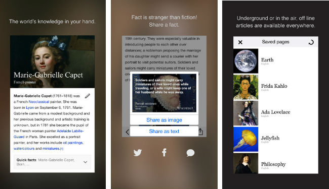 Ayrıca paylaştığınız konu ile ilgili resimlerin de eklendiği uygulamada beğendiğiniz bir sözü veya bilgiyi kart şeklindeki görsellerle paylaşmanızı sağlıyor. Wikipedia uygulaması aynı zamanda okunması gereken önemli yazılara paylaşımların alt kısmında öneriler şeklinde yer veriyor.