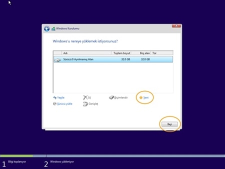 4- Disk'i bölebilir biçimlendirebilir veya sadece bir diske kurmak isterseniz gereken ayarları yapmalısınız. Eğer sıfır kurulum istiyor iseniz komple biçimlendirmeniz gerek.