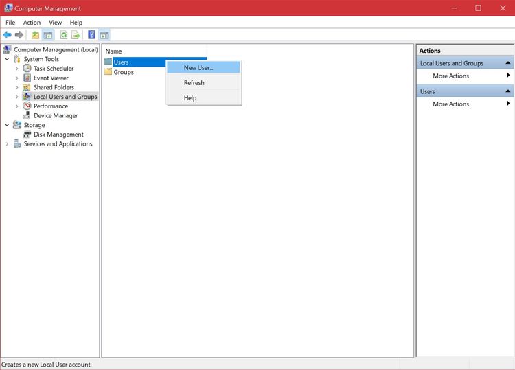 Kullanıcı hesabı oluşturmak için bilgisayar yönetimi de tercih edilebilir. Bilgisayar’a sağ tıklayarak bilgisayar yönetimine giriş yapmanız ardından yerel kullanıcılar ve gruplar sekmesinden sağ tarafta yer alan users bölümüne ulaşmanız gerekir. Users klasörünün üzerine sağ tıklayarak yeni kullanıcı seçeneğini seçmeniz ile birlikte kolayca yeni kullanıcı oluşturabilirsiniz.