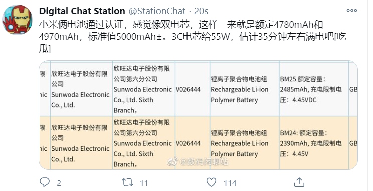 3C'nin kayıtlarında ortaya çıkan bilgilere göre Xiaomi Mi 11'in batarya kapasitesi 4.780 mAh, Mi 11 Pro'nunki ise batarya kapasitesi 4.970 mAh olacak. Yaklaşık 35 dakikada içinde bataryanın tamamını şarj edebilecek bir teknolojiye sahip olacak modeller 55W hızlı şarj teknolojisini destekleyecekler.