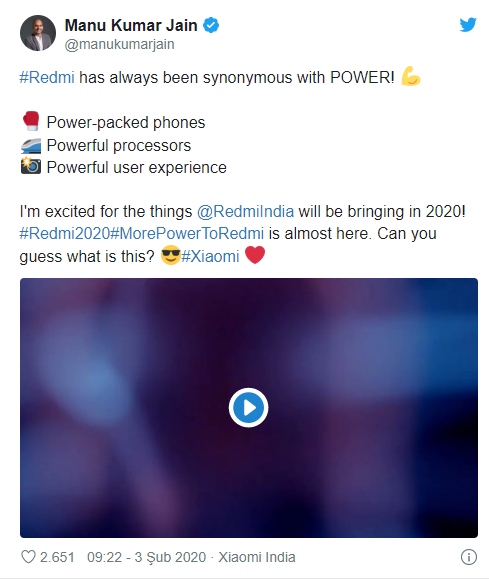 Dün Xiaomi’nin üst düzey yetkilisi Manu Kumar Jain Twitter hesabından oldukça ilgi çekici bir duyuru yaptı. “Redmi her zaman güçle eşanlamlıdır” açıklamasıyla oldukça iddialı olan Jain yaptığı paylaşımda markanın bu yıl piyasaya süreceği telefonları işaret ediyor. Açıklamanın Redmi’nin çok yakın bir zamanda tanıtacağı yeni akıllı telefonu Redmi 9 için yapıldığı da iddia ediliyor. Geçtiğimiz dönemlerde Redmi Note 7 ve Note 8 modeliyle büyük bir başarı yakalayan şirketin Redmi Note 9 ailesinde de aynı başarıyı devam ettirmesi bekleniyor.